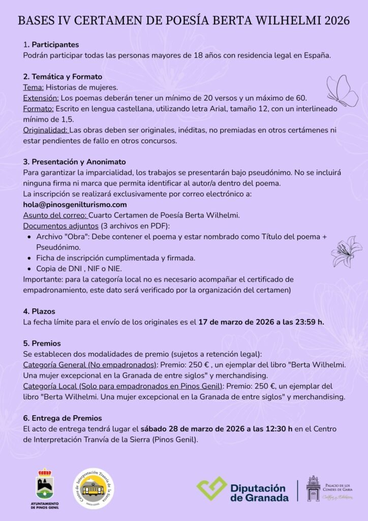 El Ayuntamiento de Pinos Genil convoca el IV Certamen de Poesía Berta Wilhelmi 2026, con temática “Historias de mujeres”.