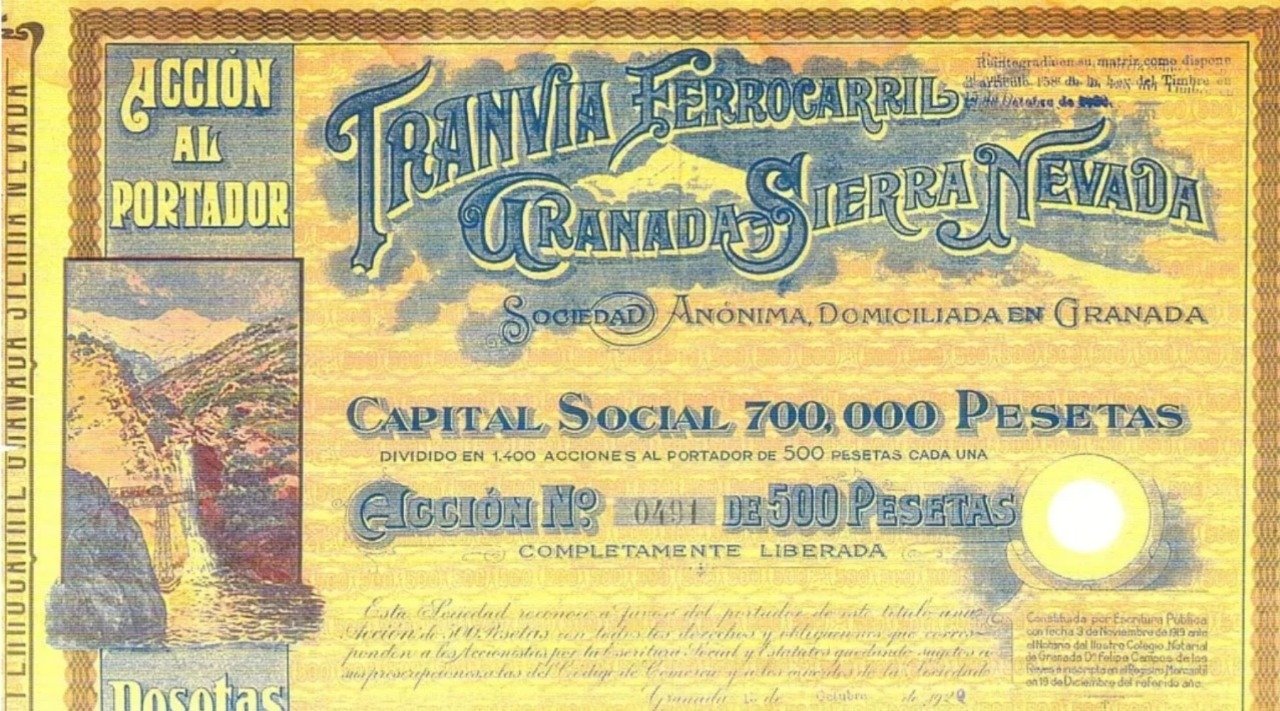 To carry it out, he set up the companies “Tranvía-Ferrocarril Granada Sierra Nevada S.A.”, with the issue of 1,200,000 nominal pesetas in mortgage bonds and “San Pedro. Eléctrica Maitena S.A.”, with the issue of 750,000 pesetas nominal in 1,500 debentures; both of 500 pesetas each and at 7% interest and through the bank of Mr. Sons of Mr. Manuel Rodríguez Acosta and Mr. González de la Cámara. The chairman of the Board of Directors of both was the Duke of San Pedro.